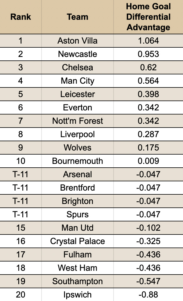 Aston Villa and Newcastle had a large one-goal bump while playing at home. What may be a 1-0 win on a neutral site might be a 2-0 or 3-1 win at Villa Park or St James' Park.