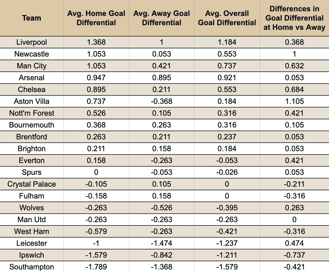 Analysis of match data without controlling for team strength shows Liverpool's dominance, evident in their overall average goal differential of +1.184 goals across all matches.