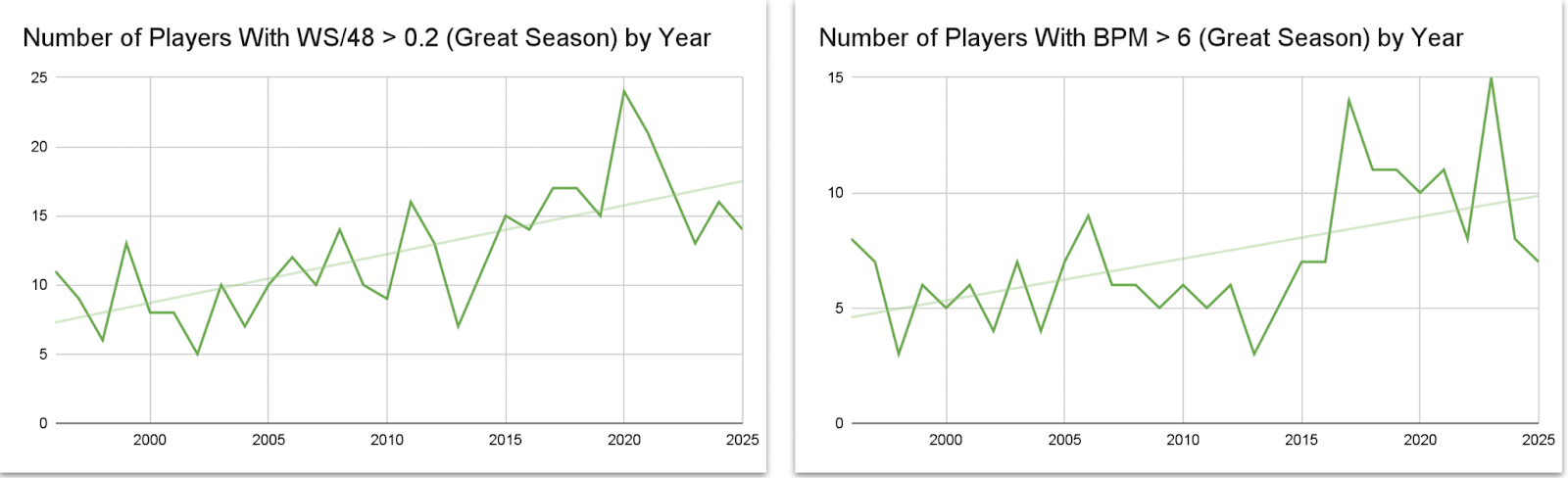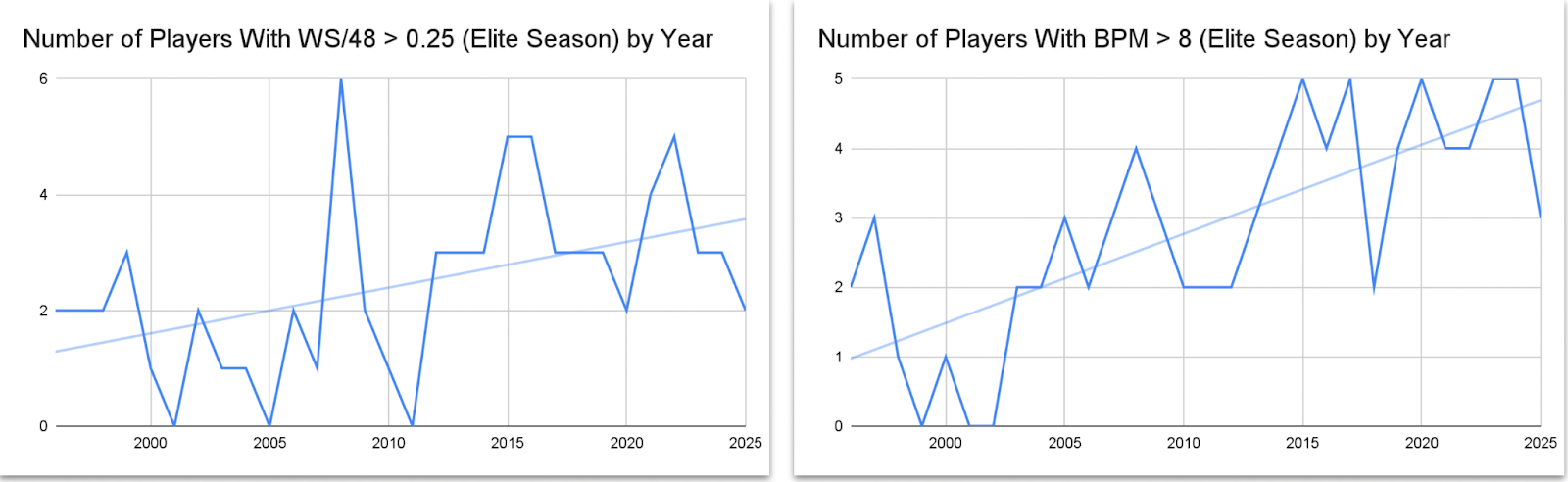 As you can see, there are clear upward trends in the data with the total number of players reaching these thresholds doubling over the last 10 seasons. The low points in the data are in the early 2000s, which fits the narrative that the NBA lacked high-level talent after Jordan’s second retirement.