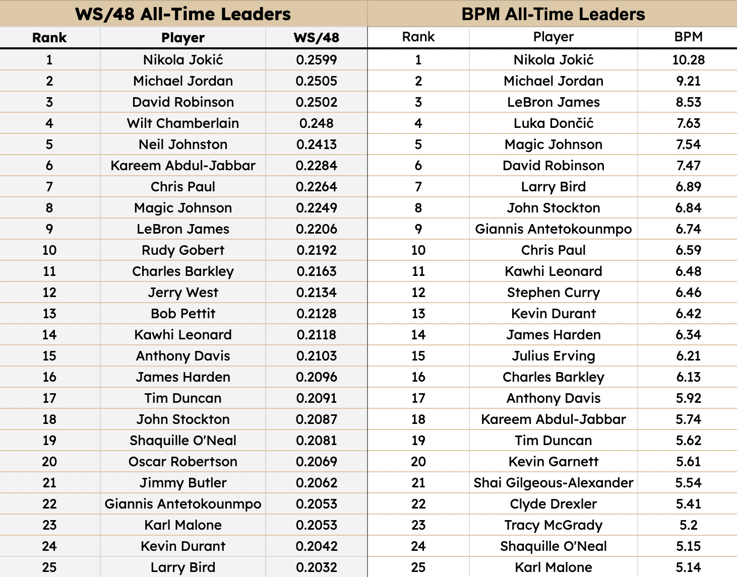 WS/48 also has its limitations. It tends to overvalue starters who play lots of minutes on good teams, even if they aren’t the key contributors. It also undervalues passing and off-ball play. Similar to BPM, it doesn’t give as much weight to defense, so it may not credit defensive-minded players as much as it should.