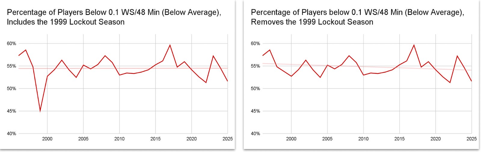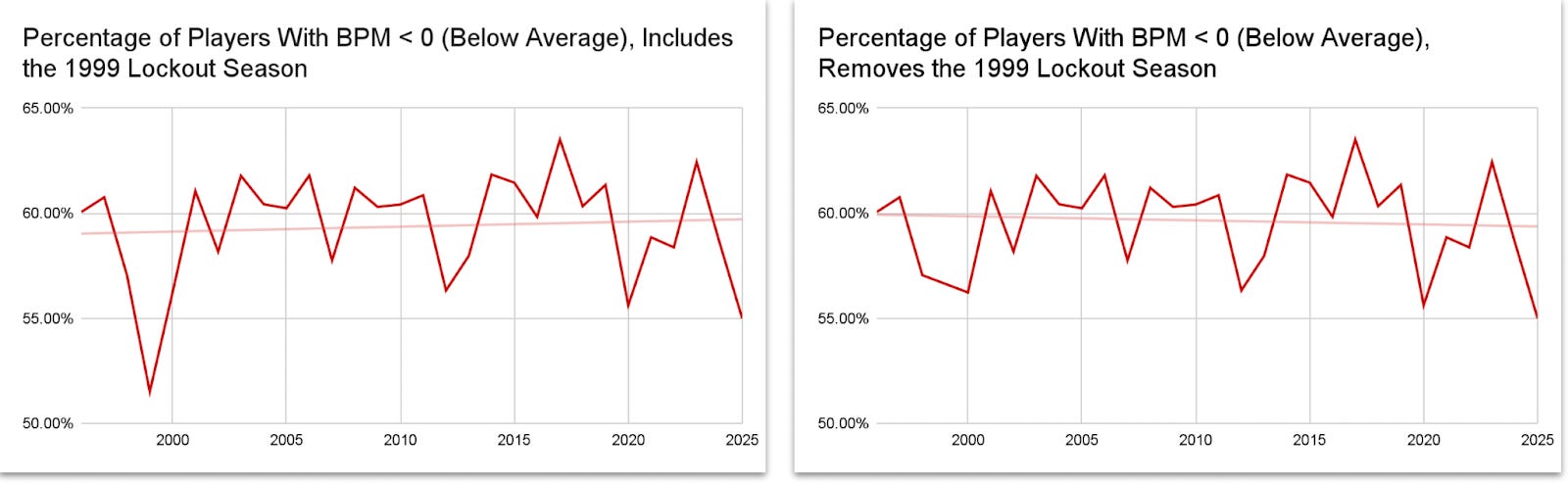 As you can see, once the 1999 season is removed, there is even a slight downward trend in the data, meaning that a smaller percentage of players are meeting this “below average” threshold. This suggests the lower half of the league's talent has been improving. With that said, the trend doesn’t seem strong enough to draw any definitive conclusions.