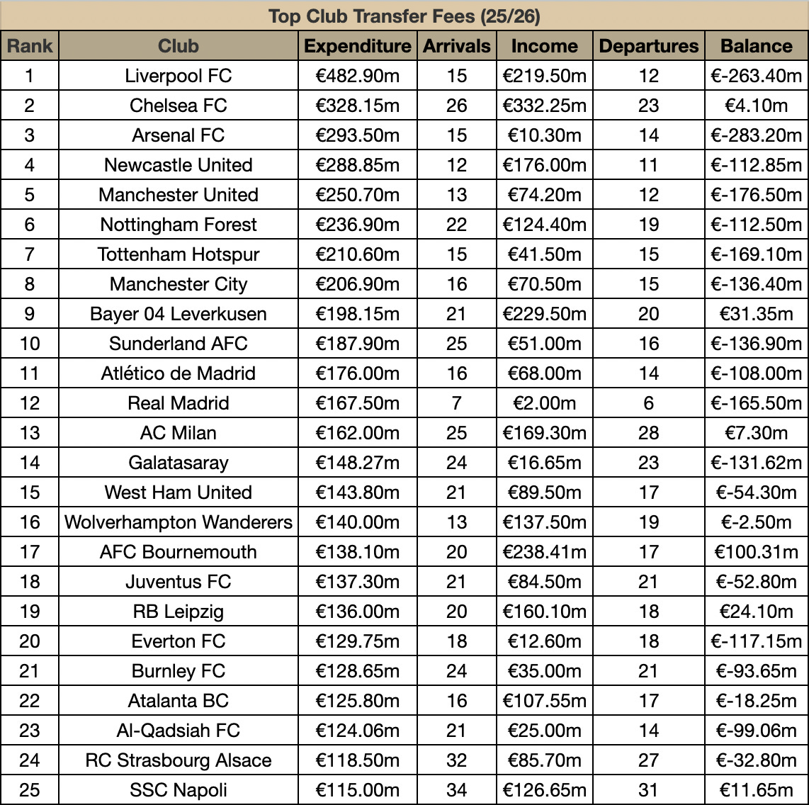 You’re absolutely right, the Premier League’s spending has grown completely out of proportion compared to the rest of Europe. In fact, the only non-English clubs consistently able to compete for elite players are Real Madrid and Barcelona, and even they’ve struggled in recent years due to financial restrictions and debt. What’s striking is that mid-table EPL clubs now often outspend traditional giants from Italy, Germany, and France: for example, West Ham, Aston Villa, and Nottingham Forest have all outspent AC Milan, Borussia Dortmund, and Marseille in recent windows. According to Transfermarkt, nine of the world’s top 10 biggest spenders this summer came from the EPL, and even across the last five seasons, Premier League clubs dominate the global spending charts, making it clear the financial balance of European football has shifted almost entirely to England