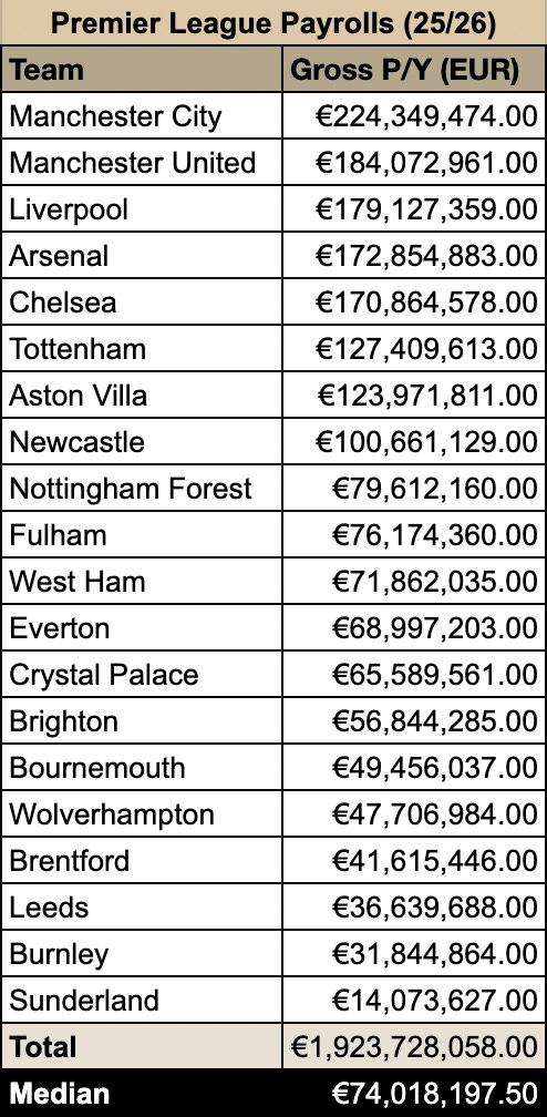 Examining the differences in player payrolls across the top five leagues reveals stark disparities. The median payroll for a Premier League team is €30 million more than the next closest league (Serie A). In fact, all Premier League clubs outside of the three recently promoted (Leeds, Burnley, Sunderland) are among the top 41 club payrolls across the top five European Leagues.